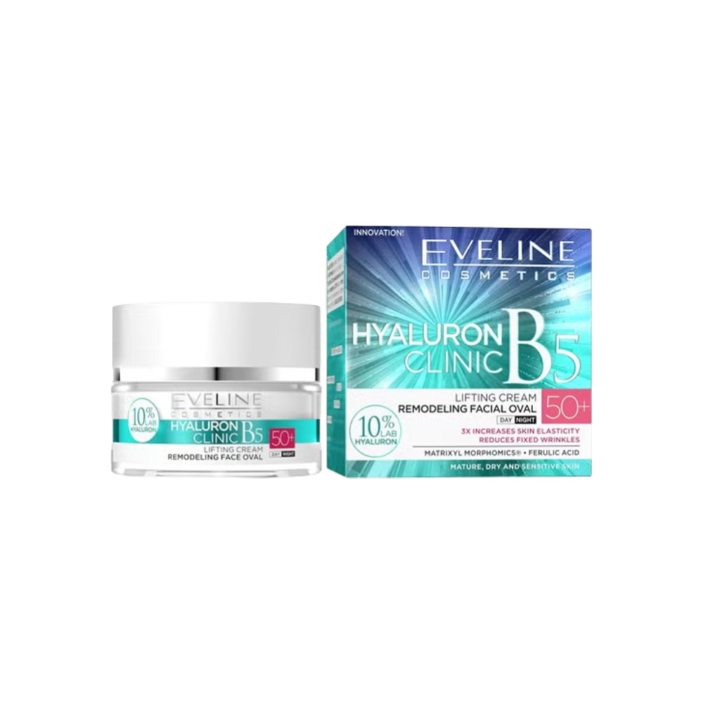 Eveline Cosmetics Hyaluron Clinic B5 50+ Lifting Remod Cream 50ml é um creme antienvelhecimento que ajuda a tratar as linhas de expressão e melhorar a firmeza da pele.