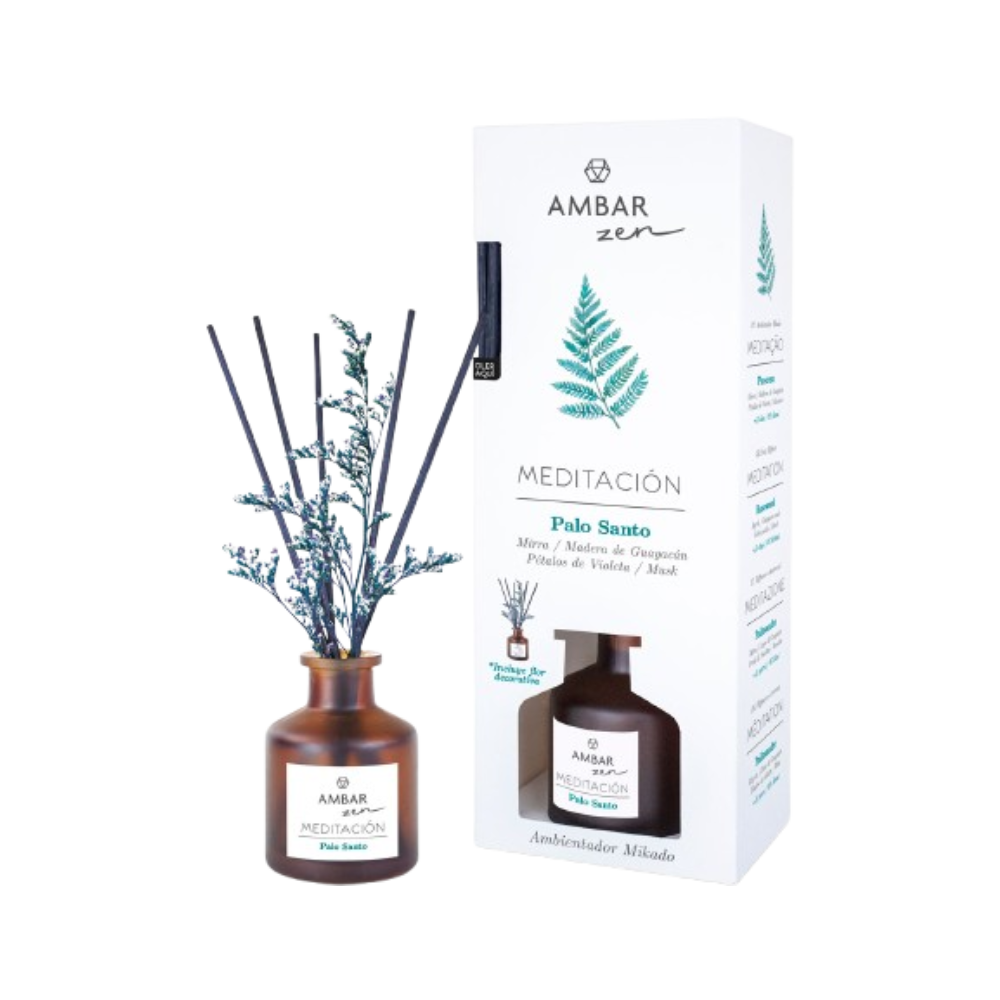 Ambientador Palo Santo Zen Mikado Ambar Zen de 40 ml, 0% de álcool e duração de +45 dias. *Inclui flor decorativa.